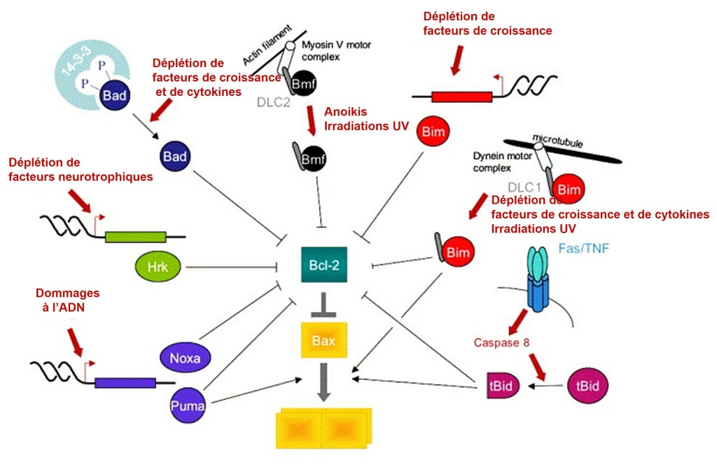 Les protéines à domaine BH3 seul sont des protéines pro-apoptotiques qui jouent le rôle de « sentinelles » capables d’intégrer divers stress cellulaires et de déplacer l’équilibre en faveur des acteurs pro-apoptotiques en antagonisant les membres de la famille anti-apoptotique Bcl-2 ou en activant Bax et Bak (Youle et Strasser, 2008). Par exemple, l’expression du gène codant la protéine PUMA est activée par p53 à la suite de dommages à l’ADN qui ne sont pas réparés et PUMA inhibe l’activité des acteurs anti-apoptotiques et stimule l’activité des acteurs pro-apoptotiques (Wang et al., 2007).