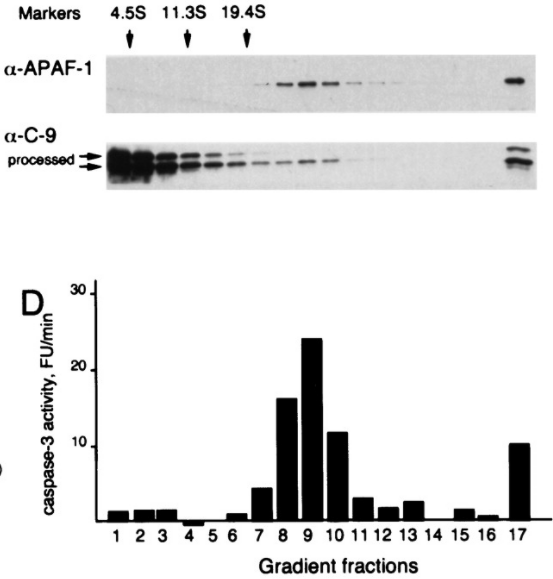 Les caspases apoptotiques sont classées en deux groupes : les caspases initiatrices (caspase-2, -8, -9 et -10) et les caspases exécutrices (caspase-3, -6 et -7). Ces protéases sont synthétisées sous forme de zymogènes inactifs. Elles doivent se dimériser pour devenir actives et cela nécessite le clivage d’un prodomaine N-terminal. Les caspases initiatrices peuvent s’auto-activer via autocatalyse, cependant, des interactions supplémentaires avec un complexe de protéines d’activation sont généralement nécessaires. Par exemple, le taux d’activation de la caspase-9 est supérieur de plusieurs ordres de grandeur par rapport à la forme libre lorsqu’elle est ancrée dans un complexe supramoléculaire appelé apoptosome contenant la protéine APAF-1 (Rodriguez et Lazebnik, 1999). La caspase-8 est plutôt activée par un autre complexe, le complexe de signalisation induisant la mort (DISC).