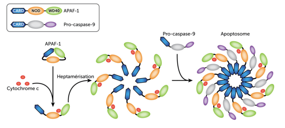 La voie intrinsèque implique les mitochondries, et notamment la libération du cytochrome c de l’espace intermembranaire mitochondrial dans le cytosol. Le cytochrome c libéré se lie à la protéine d’amarrage Apaf-1 et facilite la formation du complexe apoptosome qui recrute et active la caspase-9. Ce complexe apoptosome caspase-9/APAF-1/cytochrome c est la forme holoenzymatique de la caspase-9, qui active par clivage protéolytique l’exécuteur de l’apoptose caspase-3 comme nous l’avons vu.
