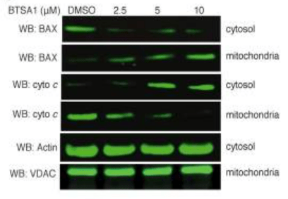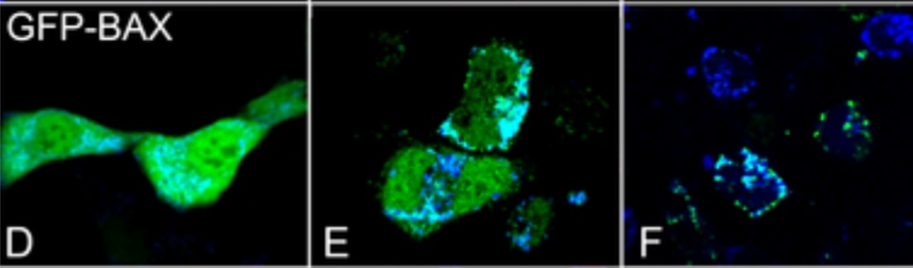 Une fois activées, les protéines multidomaines pro-apoptotiques, telles que Bax et Bak, forment des canaux sur la membrane externe des mitochondries, induisant la fuite d’agents activateurs de l’apoptose dans le cytosol, notamment le cytochrome c (Bleicken et al., 2013) ou encore Smac/Diablo, des protéines qui s’attachent aux protéines inhibitrices de l’apoptose, IAP (ou XIAP) et les inhibent (Rehm et al., 2003).
