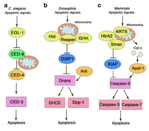 Les noms des protéines impliquées dans l’apoptose sur cette page sont ceux des Mammifères. L’apoptose a été abondamment étudiée chez le nématode C. elegans et chez la drosophile. Dans ces modèles, il existe des protéines orthologues à celles des Mammifères.