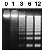 Comme les clivages se produisent dans les régions de liaison entre les nucléosomes, les fragments se séparent selon un motif en échelle caractéristique (les plus petits fragments correspondent à l’ADN dans un nucléosome, les plus grands à l’ADN dans plusieurs nucléosomes car toutes les régions entre les nucléosomes ne sont pas forcément clivées). Source : https://genesdev.cshlp.org/content/14/5/549.long