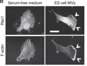 Cependant, les VE ont également un impact sur un large éventail de processus physiologiques. Dans les blastocystes de souris, Les VE produites par les cellules pluripotentes dans l’ICM sont transférés au trophectoderme pour favoriser l’implantation, une étape précoce de la grossesse dans laquelle l’embryon en développement se fixe et envahit l’utérus (Desrochers et al., 2016). Les MV transportent alors la laminine et fibronectine qui interagissent avec les intégrines le long des surfaces des trophoblastes, et déclenchent l’activation de deux kinases de signalisation, JNK et FAK, ce qui stimule la migration des trophoblastes.