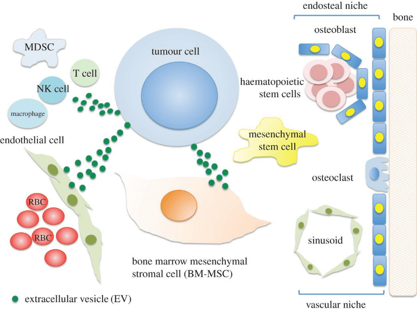 Les rôles des VE dans la progression du cancer ont été étudiés. Elles aident à façonner le microenvironnement tumoral, à promouvoir l’immunosuppression et à améliorer la croissance, la survie, l’invasion et la propagation métastatique des cellules cancéreuses (Antonyak et Cerione, 2014; Antonyak et al. ., 2011; Costa-Silva et al., 2015; Kreger et al., 2016; Van Niel et al., 2018). Par exemple, des cellules faiblement métastatiques issues de cancer du sein secrètent des vésicules extracellulaires riches en Transglutaminase 2 (Tg2) qui activent les fibroblastes environnants à produire une matrice extracellulaire favorable à la migration (Schwager et al., 2022). Les VE ont été particulièrement bien étudiées dans le cas des tumeurs des cellules sanguines dans la moelle osseuse (Ohyashiki et al., 2017).