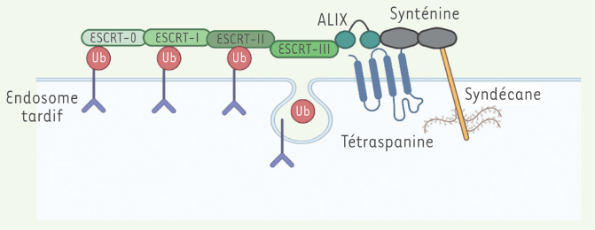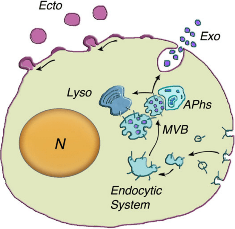 L’une des principales classes de VE est constituée par les exosomes, de petites vésicules, dont la taille varie de 30 à 150 nm de diamètre, qui se forment dans des corps multivésiculaires (MVB) et sont acheminées vers la surface cellulaire (au lieu des lysosomes où ces corps multivésiculaires aboutissent habituellement). Les MVB fusionnent avec la membrane plasmique et libèrent leur contenu, les exosomes, dans l’espace extracellulaire. Un tel processus a pu être observé in vivo par exemple lors de la formation du réseau des trachées chez la drosophile où des exosomes sont émis dans la lumière trachéale (Camelo et al., 2022).
