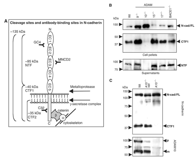 Durant la transition épithélio-mésenchymateuse des crêtes neurales, non seulement la transcription du gène codant la N-cadhérine est diminuée mais en plus la partie extracellulaire des protéines encore présentes est clivée par la métalloprotéinase ADAM10 (Shoval et al., 2007).