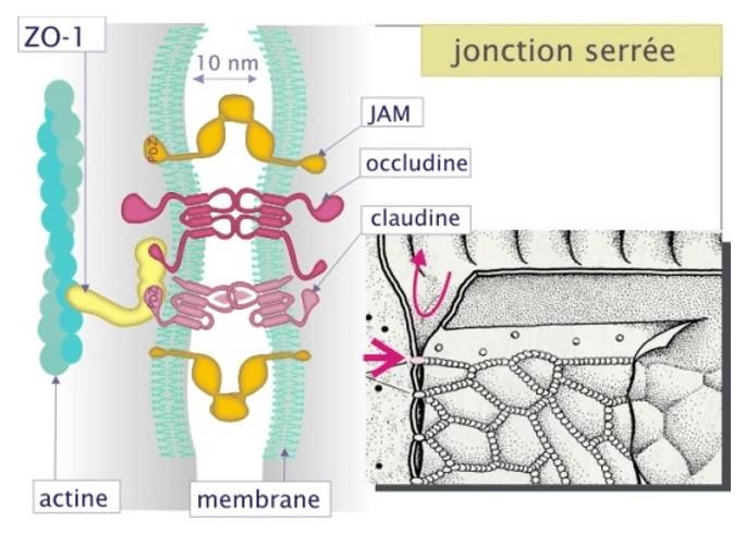 Ces jonctions serrées forment une barrière étanche qui bloque la circulation intercellulaire, assurant que les échanges de part et d’autre de l’épithélium se font à travers les cellules de manière contrôlée (perméabilité sélective de l’épithélium). Une brèche dans les jonctions serrées augmente la perméabilité entre les cellules et peut causer des pathologies (par exemple, des maladies chroniques inflammatoires de l’intestin) (Choi et al., 2017). Les jonctions serrées permettent aussi de restreindre la diffusion des protéines membranaires et donc d’assurer la spécificité de composition du domaine apical et du domaine basolatéral de la membrane plasmique des cellules épithéliales.