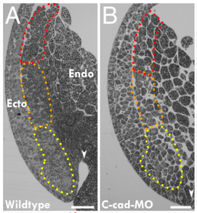 Les changements d’expression des cadhérines accompagnent les changements de destinée des cellules. L’ectoderme de la souris exprime initialement la E-cadhérine mais au cours de la neurulation, la plaque neurale destinée à devenir le tube neural éteint l’expression de la E-cadhérine et exprime la N-cadhérine à la place. Si ce changement est bloqué, la séparation des deux tissus, ectoderme non neural et neurectoderme, se fait mal.