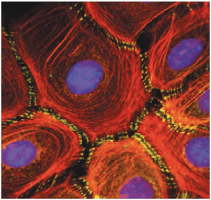 Les adhérences jonctionnelles se présentent comme des complexes moléculaires protéiques. Parmi elles, les desmosomes sont composés d’une plaque de 100 à 500 nm de diamètre, constituée de protéines telles que la desmoplakine ou la desmoglobine et de cadhérines desmosomiales transmembranaires (desmogléines, desmocollines). Comme pour toutes les cadhérines, leurs parties extracellulaires se solidarisent en présence de Ca2+. La plaque interne est reliée à des filaments intermédiaires. Les desmosomes sont impliqués dans la résistance à la déformation et au stress mécanique des épithéliums (Green et al., 2019). Ils sont aussi présents dans les jonctions entre les cardiomyocytes et permettent de les maintenir solidaires lors de la contraction musculaire cardiaque.