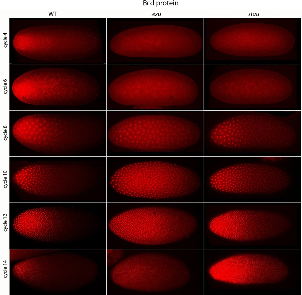 On l’a vu, la localisation antérieure de l’ARNm de bcd est fondamentale et elle dépend de la protéine Staufen. Chez le mutant perte de fonction staufen (stau), le gradient n’est pas visible comme on peut le constater sur l’une des figures précédentes (immunodétection en rouge de Bcd dans différents contextes mutants). L’ARNm de bcd est synthétisé dans les cellules nourricières qui appartiennent à la lignée germinale. Les ARNm passent entre cellules nourricières puis vers l’ovocyte grâce à des ponts cytoplasmiques. Les cellules nourricières se trouvent du côté du pôle antérieur de l’ovocyte, ainsi l’ARNm de bcd est spontanément localisé antérieurement dans un premier temps. Mais sans Staufen, les phénomènes de diffusion aboutissent à une uniformisation du gradient de l’ARNm de bcd.