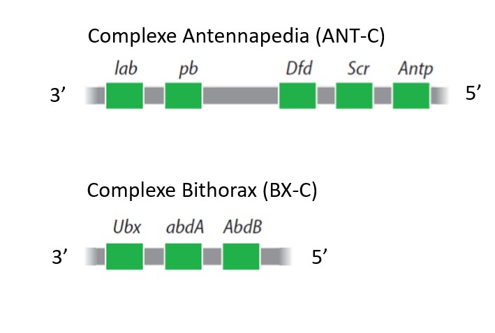 Chez la drosophile, les gènes Hox se trouvent positionnés dans deux complexes différents : le complexe ANT-C (qui fait 400 kilobases de long) et le complexe BX-C (qui fait 350 kilobases de long). Ils se trouvent sur 2 portions assez éloignées du chromosome 3 (mais ce n’est pas le cas général chez les insectes où ils sont le plus souvent contigus). Signalons que Bcd que nous avons vu agir très tôt au cours du développement précoce de la drosophile pour la mise en place de l’axe AP se trouve localisé dans le complexe ANT-C sans faire partie formellement dans ce que l’on appelle les gènes Hox.