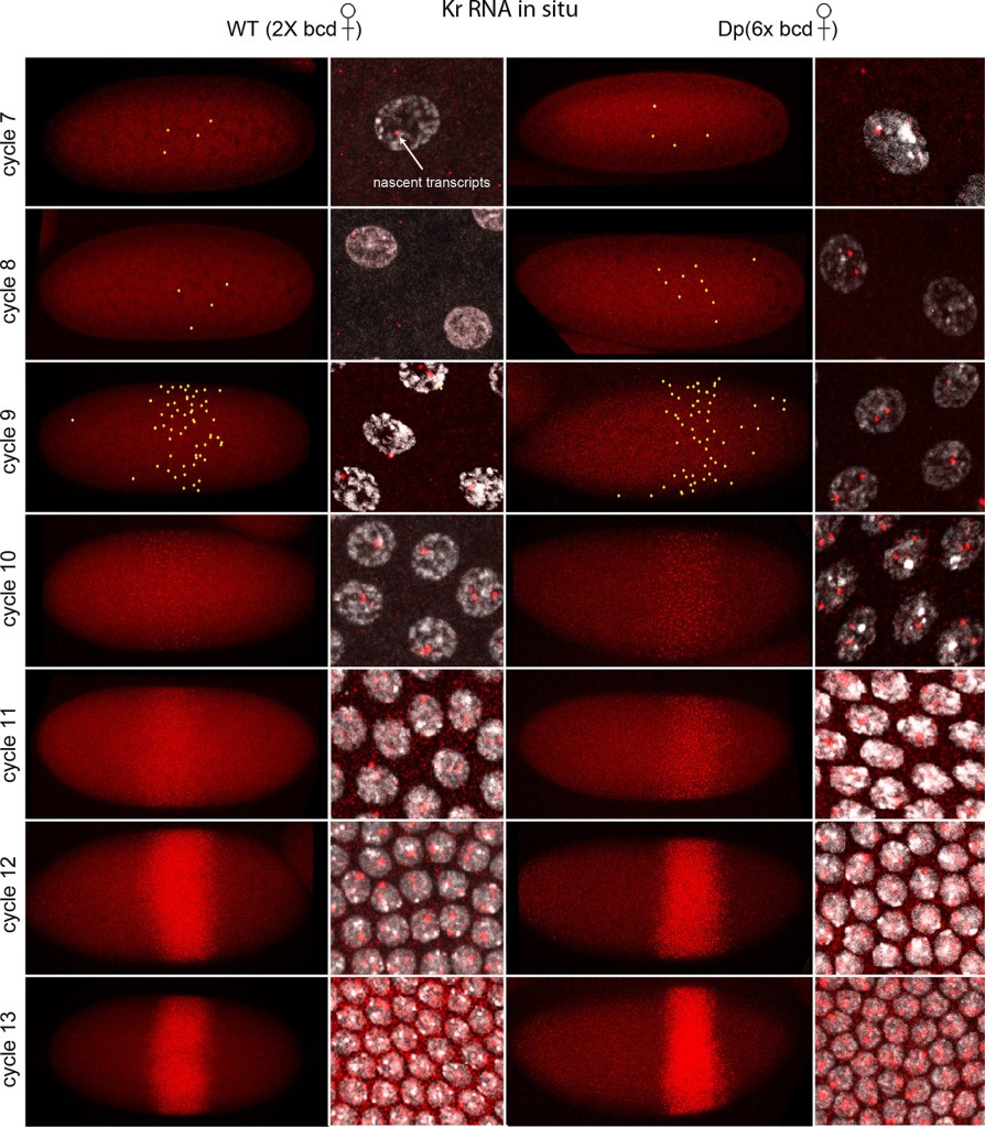 L’hybridation in situ a détecté l’ARN Kr (rouge) dans les embryons du cycle nucléaire 7-13 qui ont été produits par des femelles avec deux (deux colonnes à gauche) ou six (deux colonnes à droite) copies du gène bcd. Les embryons sont au stade de la prophase, le côté dorsal est en haut et le côté antérieur à gauche. Les images d’embryons sont des composites de projection à partir de coupes optiques en série au microscope confocal; les images à fort grossissement montrent des noyaux avec des points fluorescents rouges. Le nombre de noyaux avec des points rouges et l’intensité des points augmentent à chaque cycle successif. Deux points sont visibles dans la plupart des noyaux ; certains n’en ont qu’un mais aucun n’en a trois. Les points jaunes dans les embryons du cycle nucléaire 7-9 indiquent des points trop pâles pour être visibles à faible grossissement. La largeur de la bande des noyaux exprimant Kr était approximativement la même dans les deux génotypes ; sa position s’est déplacée « plus postérieurement » dans les embryons avec un excès de Bcd, ce qui est attendu (les embryons sont antériorisés donc l’expression de Kr est repoussée vers une position qui semble plus postérieure). Source : https://elifesciences.org/articles/13222