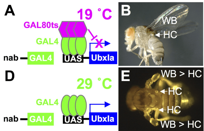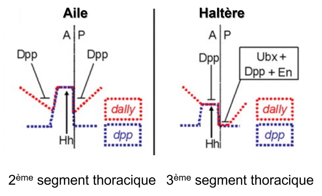 Comme le gène Ubx est exprimé dans des régions homologues à la fois chez la drosophile et les insectes à quatre ailes, tels que les papillons, c’est l’acquisition évolutive de nouveaux gènes cibles de Ubx qui est responsable de la perte de la deuxième paire d’ailes dans les diptères tels que la drosophile. Les recherches visant à identifier les gènes cibles de Ubx responsables de la transformation d’une aile en haltères ont montré qu’Ubx modifie notamment l’expression de dpp (l’orthologue des BMP chez la drosophile) qui est un morphogène important pour le développement des ailes (Agrawal et al., 2011; Crickmore et Mann, 2007; Makhijani et al., 2007; Pavlopoulos et Akam, 2011).