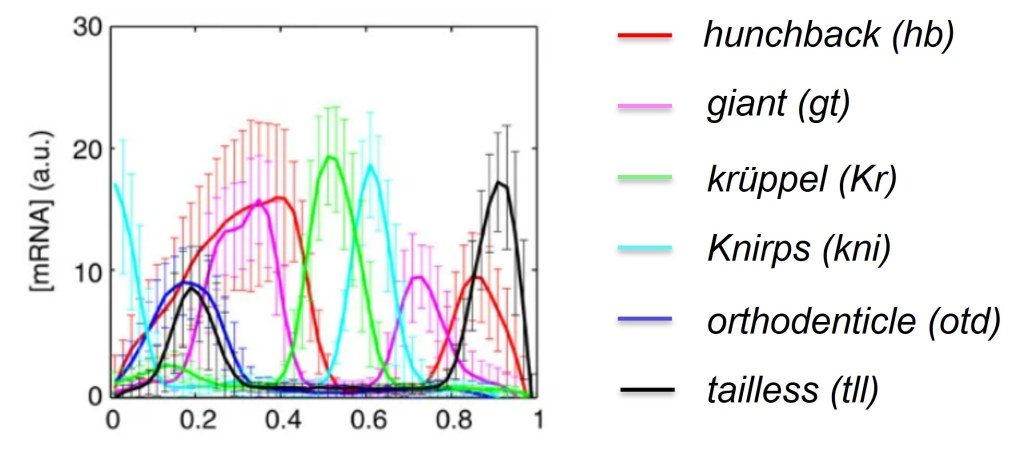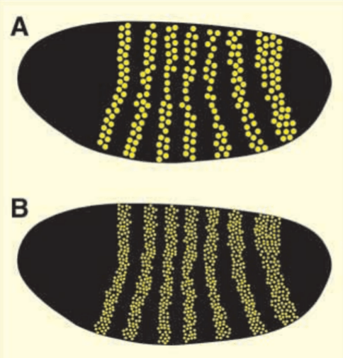 La distance entre les bandes est précisément déterminée par les différents gradients des gènes gap et même une modification du nombre de noyaux ne perturbe pas cet agencement (Day et Lawrence, 2000).
