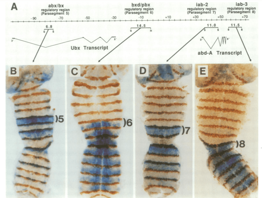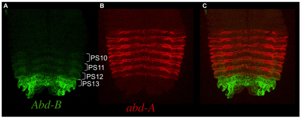 Ubx est fortement exprimé dans le troisième segment thoracique tout au long du développement, en commençant dans l’embryon lors de la subdivision de l’axe corporel AP, où il influence la structuration segmentaire des ceintures denticulaires cuticulaires de la larve (Crocker et al., 2015). Il existe également une expression d’Ubx dans les segments abdominaux, où il coopère avec deux autres facteurs de transcription du complexe BX-C abd-A et Abd-B pour modifier le motif de la ceinture denticulaire et réprimer la formation d’appendices dans l’abdomen (Castelli-Gair et al., 1995; Gebelein et al., 2002).