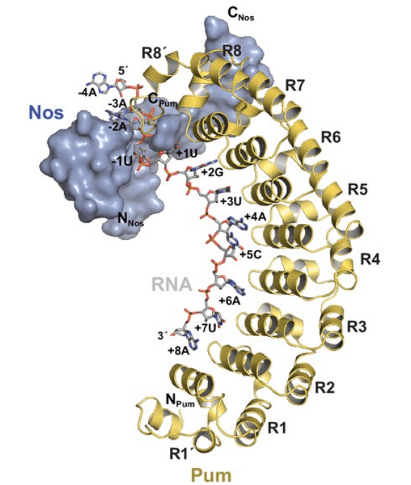 Nanos ne reconnaît pas seul les ARNm cibles ; des expériences sur trois cibles régulatrices de Nanos bien étudiées – hb, bcd et CycB – ont montré que Nanos se lie conjointement avec Pumilio (Pum) à des éléments de séquence conservés dans chaque 3′-UTR (appelé NRE pour Nanos Response Elements) (Marhabaie et al., 2024). Pumilio est une protéine de liaison à l’ARN de grande spécificité qui est uniformément distribuée dans l’embryon précoce. Pumilio reconnaît 8 nucléotides, un avec chacune des 8 répétitions qui constituent son domaine Puf de liaison à l’ARN. En revanche, Nanos n’a essentiellement aucune spécificité de liaison propre, mais peut être recruté spécifiquement pour les complexes Pumilio-ARN. Des études structurelles ont montré que la queue C-terminale de Nanos interagit avec le domaine Puf de liaison à l’ARN de Pumilio pour modifier sa conformation, permettant aux deux protéines de se lier de manière coopérative à des sites qui fonctionnent in vivo en tant qu’éléments régulateurs Nanos (NRE) (Weidmann et al., 2016).
