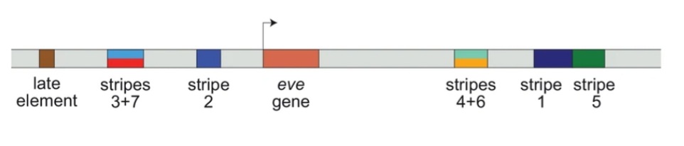 Les promoteurs et enhancers des gènes gap sont modulaires, c’est-à-dire qu’ils présentent des séquences discrètes qui contrôlent leur expression dans une ou deux bande.s en particulier. Quand on mute l’une de ces séquences régulatrices, une bande d’expression de gène pair-rule disparaît mais les autres restent normales. Ce sont des combinaisons de protéines codés par les gènes gap qui interviennent principalement pour activer (ou réprimer) l’expression des gènes pair-rule.