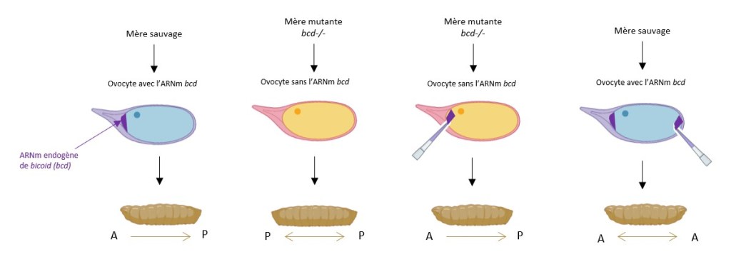 L’ARNm bicoid (bcd) exprimé par la mère contient des séquences de localisation dans son 3’UTR qui aboutissent à la concentration des transcrits au pôle antérieur de l’ovocyte puis des embryons de drosophile. Lors de la fécondation, la traduction de ces transcrits localisés aboutit à un gradient de protéine le long de l’axe AP (découvert par Driever et Nüsslein-Volhard en 1988). La synthèse dans le pôle antérieur est suivie de la diffusion, ainsi que du transport « de retour » vers le côté antérieur ou de la dégradation des protéines, ce qui affine la forme du gradient Bcd (Durrieu et al., 2018).