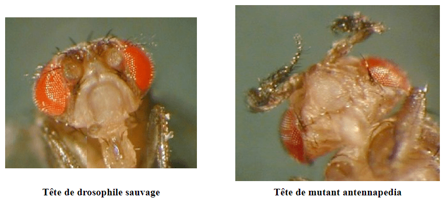 De même, des mutations homéotiques affectant la région antérieure ont été caractérisées telle la mutation Antennapedia (Antp) où des pattes se développent à la place des antennes.