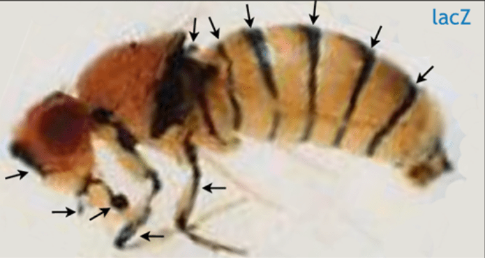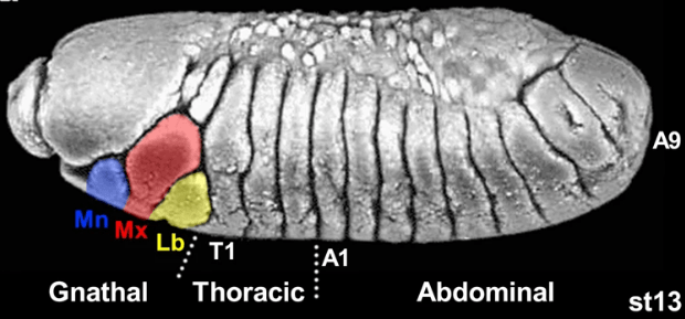 Les insectes sont des organismes segmentés (métamérisés) le long de l’axe antéro-postérieur (AP). Plusieurs segments sont rassemblés en tagmes : tête, thorax, abdomen. Il y a une forte régionalisation des segments ce qui est évident lorsqu’on observe les appendices spécifiques pour chacun d’entre eux (antennes, pièces buccales, pattes…). Cette régionalisation se met en place par une cascade de régulation d’expression génique qui démarre très tôt, dès l’ovogenèse.