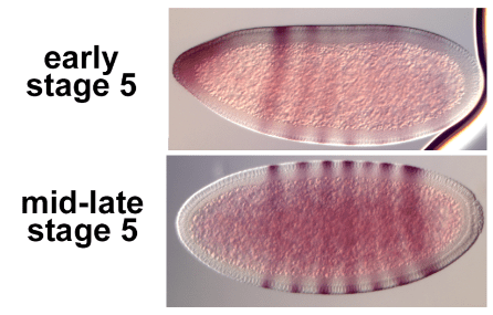 Une segmentation plus fine est mise en place grâce aux gènes pair-rule qui commencent à être exprimés au cycle nucléaire 13 alors que l’embryon se prépare à être cellularisé. Les gènes pair-rule sont exprimés dans un parasegment sur deux. Cela donne des patrons d’expression avec 7 bandes.