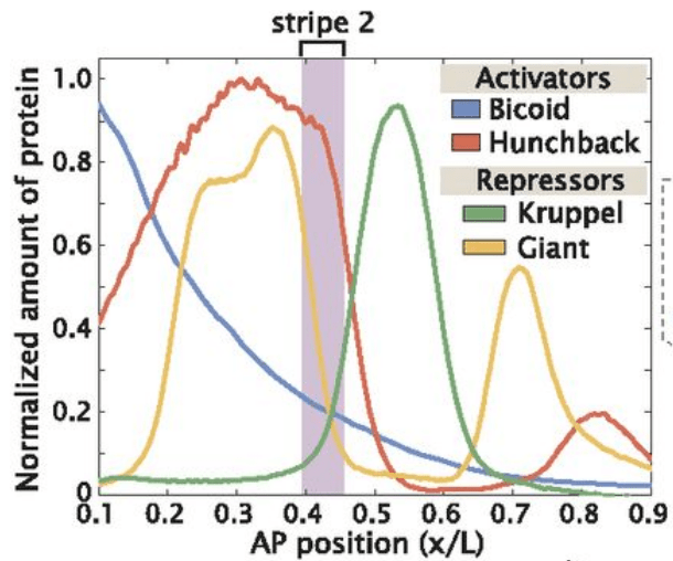 Bcd devient inutile à la fin de la cycle nucléaire 14. À ce stade, les limites d’expression de nombreuses cibles, notamment hb, knirps (kni) et Krüppel (Kr), sont maintenues par la régulation croisée des gènes gap qui fonctionnent comme des répresseurs (Jaeger et al., 2004; Liu et al., 2013; Manu et al., 2009).