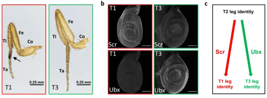 Au cours de l’évolution des insectes, le dernier ancêtre commun de tous les insectes volants était à quatre ailes (une paire sur le 2ème segment thoracique + une paire sur le 3ème segment thoracique; le premier segment thoracique ne porte jamais d’ailes), comme en témoigne les archives fossiles. L’ordre des Diptères à deux ailes auquel appartient la drosophile apparait plus tard (Carroll et al., 1995). À la place de la 2ème paire d’ailes, les diptères présentent sur le 3ème segment thoracique une paire de structures rudimentaires appelées «haltères», qui sont des organes d’équilibration pendant le vol. Cette transformation évolutive d’aile en haltère est considérée comme un exemple d ‘«homéose» [vient du terme grec signifiant «remplacement»; terme inventé par William Bateson en 1894]. La découverte des mutants classiques du complexe bithorax (BX-C) par Calvin Bridges ont été les premiers exemples de transformation « homéotique » observés directement (Bridges, 1944). Dans le cas de la mutation perte-de-fonction ultrabithorax, les haltères sont transformés en ailes, et donc le 3ème segment thoracique devient une réplique du 2ème segment thoracique. On retrouve alors le plan d’organisation « classique » des insectes avec deux paires d’ailes.
