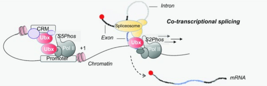 Ubx agit essentiellement en tant que facteur de transcription grâce à son homéodomaine, mais il est impliqué également dans l’épissage alternatif : il se déplace au cours de la transcription en complexe avec l’ARN polymérase II et il est aussi capable d’interagir directement avec des ARN. Il contribue à recruter différents éléments du spliceosome en cours de transcription (Carnesecchi et al., 2021).