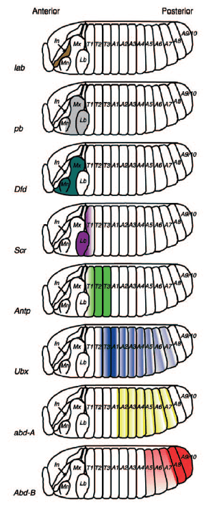 lab = labial palps; pb = proboscipedia; Dfd = Deformed; Scr = Sex combs reduced; Antp = Antennapedia; Ubx = Ultrabithorax; abdA = abdominal A; AbdB = Abdominal B.