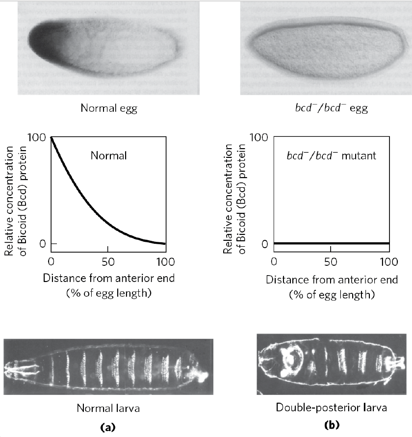 Les images du haut obtenus par immunohistochimie montrent la distribution de la protéine Bicoid (Bcd) dans un œuf normal (à gauche) et un œuf mutant bcd⁻/bcd⁻ (à droite). Les graphiques du milieu illustrent la concentration relative de Bicoid en fonction de la distance depuis l’extrémité antérieure (à droite). Dans l’œuf normal, un gradient antéro-postérieur de Bicoid est observé, tandis que l’œuf mutant ne présente aucune concentration détectable de cette protéine. En conséquence, les larves obtenues (en bas) diffèrent : la larve normale (a) présente une segmentation typique avec une tête, un thorax et un abdomen bien définis, tandis que la larve mutante (b) adopte un phénotype « double-région postérieure », dépourvu de structures céphaliques et antérieures, confirmant le rôle essentiel de bicoid dans la spécification de ces régions. Source : https://www.cell.com/cell/abstract/0092-8674(88)90183-3