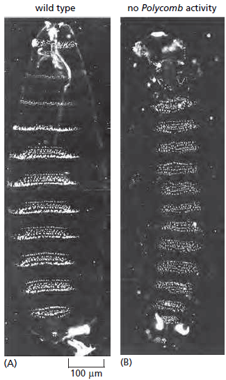 Une fois activée, l’expression (ou la non-expression) des gènes du complexe Hox doit être maintenue alors que les facteurs de transcription qui ont induit (ou inhibé) leur expression ne sont plus exprimés. Ce contrôle se fait par des modifications épigénétiques stables. Les protéines d’identité cellulaire appartenant aux groupes « Polycomb » (PcG) et « Trithorax » sont des familles qui ont été découvertes chez la drosophile et qui sont capables de remodeler la structure de la chromatine et de moduler ainsi l’expression des gènes du développement. Ces protéines s’associent à l’ADN ainsi qu’à des facteurs de transcription responsables de la régulation des gènes du développement. Polycomb et Trithorax ont des rôles antagonistes : les protéines Polycomb maintiennent les gènes homéotiques Hox « éteints », alors que les protéines Trithorax les maintiennent actifs.