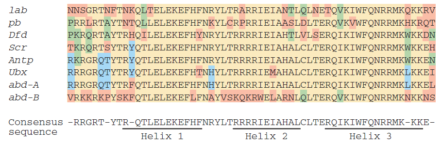 Les séquences d’acides aminés des homéodomaines des différents gènes Hox (lab, pb, Dfd, Scr, Antp, Ubx, abd-A, abd-B) sont alignées afin de comparer leur similarité. Les acides aminés conservés sont indiqués par du jaune, montrant le haut degré de conservation entre les différentes protéines. Les acides aminés en vert et bleu sont partagés par plusieurs homéodomaines tandis que les acides aminés en orange sont spécifiques à un homéodomaine. En dessous, la séquence consensus est indiquée, représentant les acides aminés les plus fréquents à chaque position. Les trois hélices α caractéristiques de l’homéodomaine sont soulignées : elles constituent la structure tridimensionnelle responsable de la liaison à l’ADN. Source : https://www.academia.edu/22160235/From_DNA_to_Diversity_Molecular_Genetics_and_the_Evolution_of_Animal_Design_by_S_B_Carroll_J_K_Grenier_and_S_D_Weatherbee