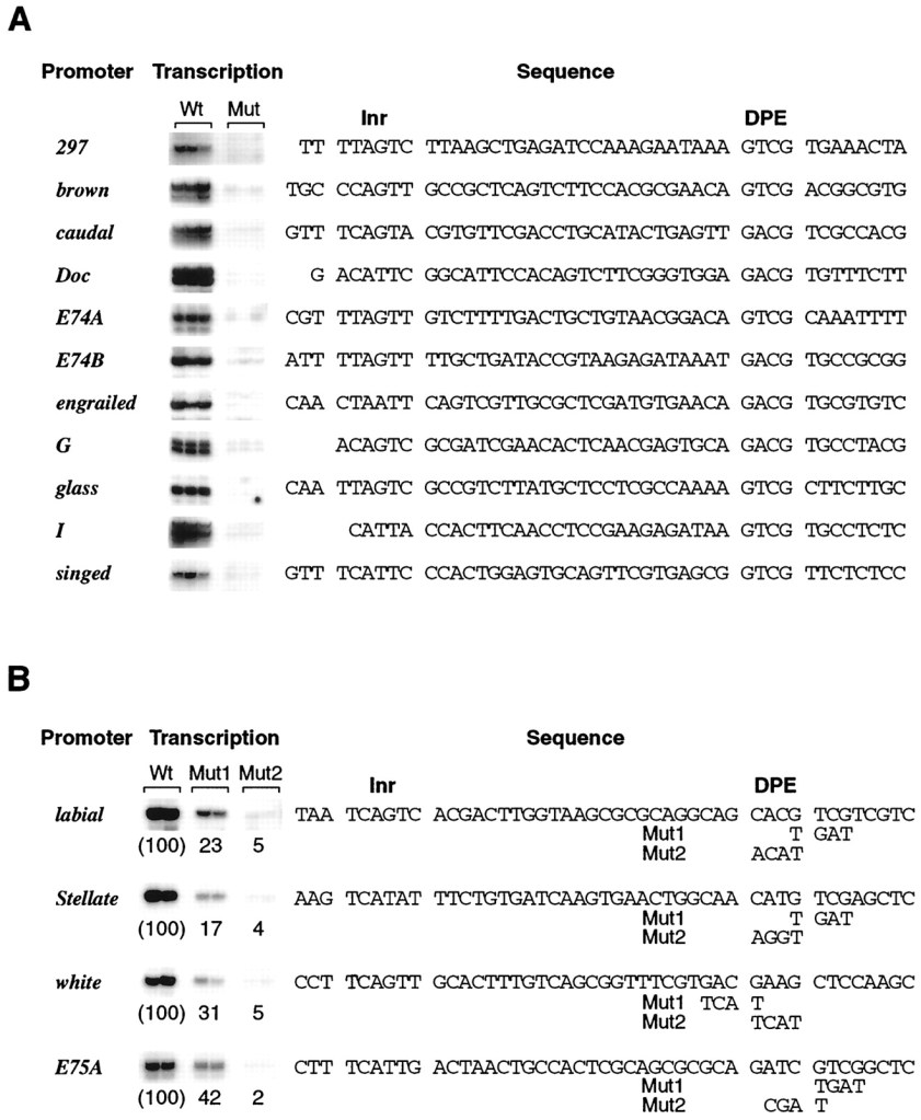 Les gènes homéotiques Hox spécifient l’identité des segments le long de l’axe antéro-postérieur de l’embryon en développement chez tous les animaux multicellulaires. Tous les promoteurs des gènes Hox de drosophile n’ont pas de boîte TATA, et la majorité d’entre eux contiennent des motifs DPE fonctionnels (Juven-Gershon et al., 2008). Fushi tarazu (ftz) est un gène pair-rule orchestrant la phase de segmentation du développement embryonnaire de la drosophile, exprimé le long de l’axe antéro-postérieur. Le promoteur de ftz contient une boîte TATA et une séquence DPE mais le facteur de transcription Caudal active préférentiellement la transcription de ftz via la séquence DPE (Juven-Gershon et al., 2008).