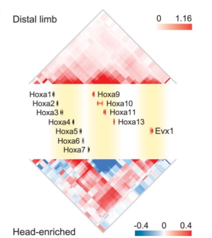 Au locus HoxD, les TAD flanquant le groupe de gènes de la partie 3′ du complexe dirigent l’expression précoce des Hox exprimés dans la région proximale du membre et ceux à côté de la partie 5′ du complexe dirigent l’expression plus tardive des Hox exprimés dans la région distale. Au cours du temps, il y a un changement de la topologie chromatinienne qui permet de passer d’un patron d’expression précoce des gènes du locus HoxD à un patron d’expression tardif (Andrey et al., 2013).