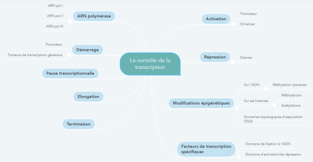 Le contrôle de la transcription fait intervenir non seulement des séquences d’ADN régulatrices mais aussi des modifications non codées avec les nucléotides habituels (A, T, C, G) ainsi que l’état de la chromatine, qui désigne le complexe que l’ADN forme avec des protéines, notamment les histones. Cela correspond au contrôle dit épigénétique de la transcription.