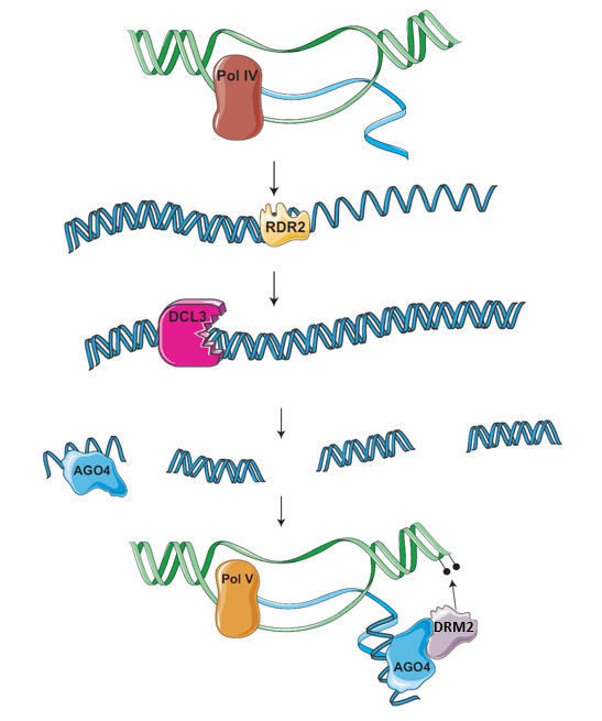 Chez les plantes, la méthylation de novo des séquences CG chez les plantes est principalement contrôlée par DRM2 avec en partie la voie de méthylation de l’ADN dirigée par l’ARN et maintenue par l’ADN méthyltransférases 1 (MET1), un homologue de Dnmt1. La méthylation de novo des séquences CHH est réalisée par DRM2, tandis que celle des séquences de type CNG est réalisée par CMT3 (Chan et al. 2005). Des changements importants de méthylation peuvent être causés par certains stress : par exemple, un stress thermique induit une augmentation de l’expression de DRM2 et une hausse de la méthylation dans le génome d’Arabidopsis (Naydenov et al., 2015).