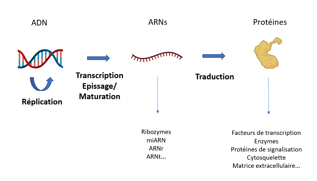 La transcription désigne la production d’ARN en prenant comme matrice une séquence d’ADN. Les ARN produits peuvent être ensuite traduits en protéines ou non.