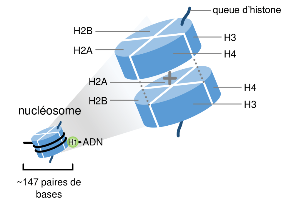 Dans des conditions physiologiques, les histones ne forment pas spontanément de nucléosomes. Des protéines appellées chaperons d’histones lient les hétérodimères d’histones et protègent leurs surfaces de liaison à l’ADN pour empêcher l’agrégation et le dépôt anormal d’histones. Ces chaperons facilitent en parallèle l’assemblage des nucléosomes correctements composés au bon endroit. Ils assemblent les nucléosomes de manière progressive, avec le tétramère (H3-H4)2 qui est déposé en premier sur l’ADN, suivi de l’ajout de deux dimères H2A-H2B (Das et al., 2014). Après leur dépôt, la position et la composition des nucléosomes peuvent être ajustées par des remodeleurs de chromatine dépendants de l’ATP. Ces enzymes utilisent l’hydrolyse de l’ATP pour perturber les interactions ADN-histone, modifiant ainsi la structure de la chromatine en transloquant, en éjectant ou en échangeant des histones (Zhou et al., 2016).