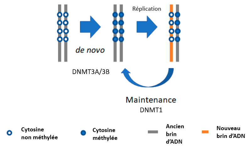 L’ajout d’un résidu méthyl sur une cytosine à une position du génome qui n’en avait jamais eu s’appelle la méthylation de novo. Elle est catalysée par les ADN méthyltransférases DNMT3a et DNMT3b. DNMT3L peut interagir avec ces enzymes et augmenter leur activité enzymatique, mais elle n’a pas d’activité enzymatique propre (Gujar et al., 2019). Lors de la réplication, une séquence 5’-CpG-3’ méthylée sur un brin de l’ADN est reconnue et méthylée sur l’autre brin néoformé par une ADN méthyltransférase particulière, Dnmt1, ce qui lui permet de se perpétuer dans une lignée cellulaire, assurant une mémoire épigénétique. Cette réaction s’appelle la méthylation de maintien.