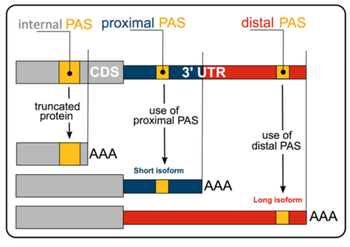 Des terminaisons non conformes de la transcription peuvent aboutir à des pathologies. Par exemple, une mutation qui rajoute une séquence PAS dans le gène codant la CyclineD1 aboutit à un ARNm dont la partie 3’UTR est tronqué et ne possède plus le site de fixation d’un microARN (miR-16-1) qui inhibe la traduction de l’ARNm aboutissant à une surexpression de la CyclineD1 et à un cancer (Chen et al., 2008).