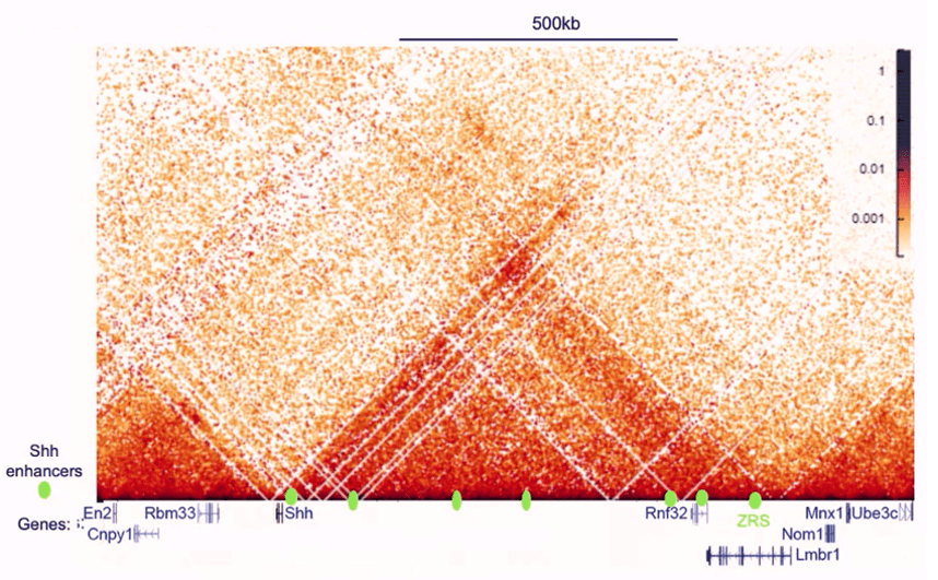 Shh et son amplificateur ZRS sont aux extrémités opposées du même TAD, mais la distance de 1 Mb entre eux est considérablement réduite dans l’espace 3D par le repliement de la chromatine (Symmons et al., 2016; Williamson et al., 2016). Si on introduit une mutation qui détruit les frontières du TAD, l’expression de Shh est abolie car le repliement de la chromatine ne se fait pas correctement et ZRS se retrouve trop éloigné du promoteur de Shh. Si, par une nouvelle mutation, on rapproche ZRS du promoteur, alors l’expression est en partie restaurée (voir cette figure).