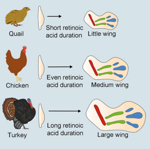 Le rythme de déroulement du programme génétique du développement peut aussi être un paramètre affecté au cours de l’évolution. Par exemple, la comparaison de la formation des somites chez l’embryon de poulet et chez l’embryon de python montre que le rythme de l’horloge interne du mésoderme présomitique est quatre fois plus rapide chez le python, expliquant le nombre très élevé de somites (et donc de vertèbres) produits (Gomez et al., 2008). Autre exemple, en comparant la formation de l’aile de la caille, du poulet et du dindon, on se rend compte que le temps d’action de l’acide rétinoïque qui stimule le développement des régions proximales est différent et corrélé à la taille de l’aile. La manipulation du temps d’exposition des cellules du bourgeon de membre à l’acide rétinoïque suffit à transformer la morphologie d’une aile de caille en celle approchant une aile de poulet et de même entre une aile de poulet et une aile de dindon (Stainton et Towers, 2022).