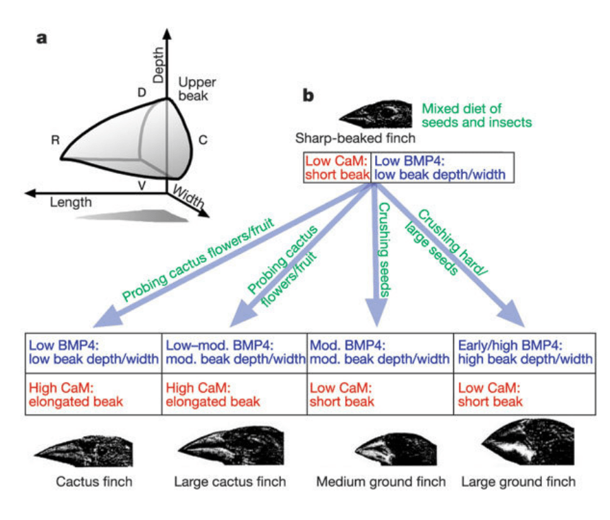 Les mutations sélectionnées peuvent modifier un réseau de régulation génique ou peuvent être plus subtiles telles des modifications quantitatives de l’expression des gènes. Par exemple, la diversité de la taille des becs des pinsons de Darwin des îles Galapagos dépend du niveau d’expression de BMP4. La manipulation du niveau d’activité de la voie BMP4 chez l’embryon de poulet aboutit à des modifications morphologiques du bec cohérentes avec ce modèle (plus BMP4 est exprimé, plus le bec est gros) (Abzhanov et al., 2004). Le niveau d’expression de la calmoduline est également impliqué dans le contrôle de la longueur du bec (Abzhanov et al., 2006).