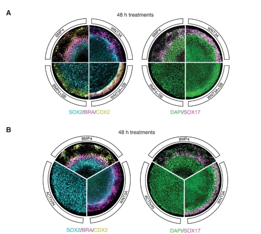 Egalement, Warmflash et al., 2014 ont rapporté que les cellules ES humaines cultivées dans des micro-disques recouverts de matrice extracellulaire (ECM) et stimulées avec BMP4, se différencient de manière reproductible en anneaux cellulaires, exprimant des marqueurs d’ectoderme, mésoderme, endoderme et de trophectoderme, disposés à partir du centre vers la périphérie. Les cellules mésendodermiques dans ces cultures présentent des caractéristiques de transitions épithélio-mésenchymateuses. Des gastruloïdes humains ont pu être obtenus et permettre l’étude des voies de signalisation BMP, Nodal et Wnt durant une période de développement jusqu’alors inaccessible (Yoney et al., 2018; Chhabra et al. 2019).