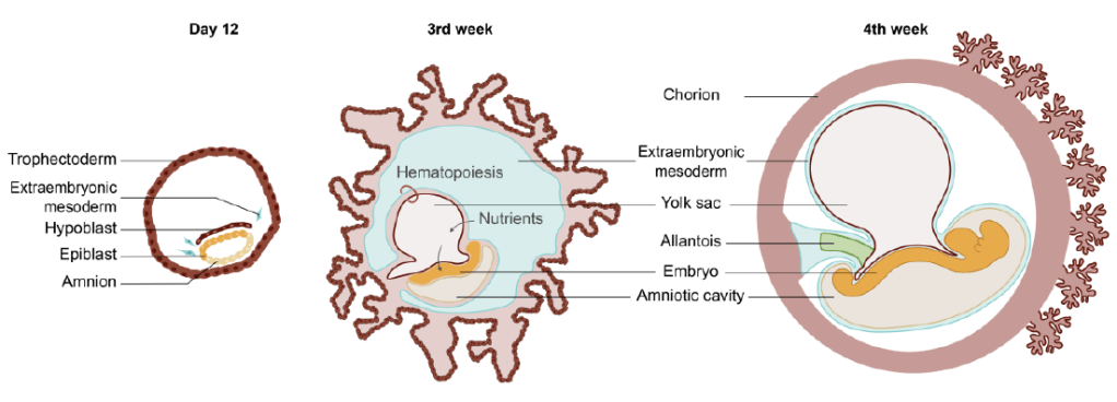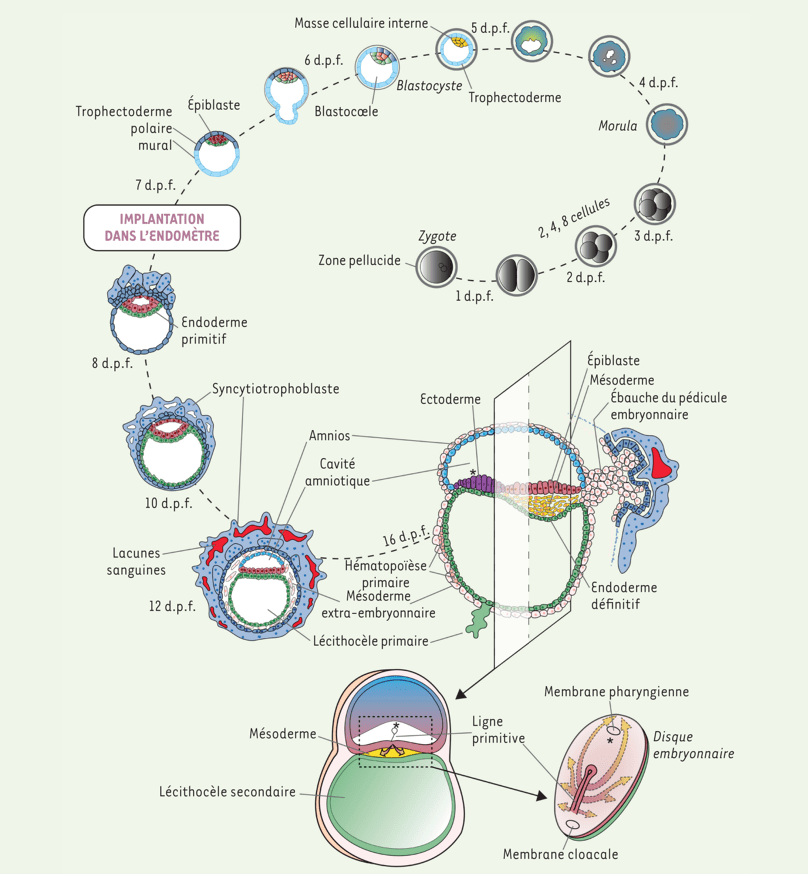 Blastocyste (5–6 jours) : Formation d’une cavité (blastocoele), différenciation en trophectoderme et masse cellulaire interne (futur embryon). Implantation (7–8 jours) : Le blastocyste s’implante dans l’endomètre. La masse cellulaire interne donne naissance à l’épiblaste et à l’hypoblaste (endoderme primitif). Le trophectoderme se différencie en trophectoderme mural et polaire. Développement des annexes embryonnaires (10–12 jours) : Formation du syncytiotrophoblaste (interface avec l’endomètre maternel), apparition de la cavité amniotique. Formation du mésoderme extra-embryonnaire et des lacunes sanguines : mise en place du support vasculaire nécessaire aux échanges avec la mère. Gastrulation (16 jours) : Apparition de la ligne primitive, formation du mésoderme intra-embryonnaire, mise en place des trois feuillets embryonnaires (ectoderme, mésoderme, endoderme définitif) dans le disque embryonnaire tridermique. dpf = jours après la fécondation. Source : https://www.medecinesciences.org/en/articles/medsci/full_html/2023/02/msc220234/msc220234.html