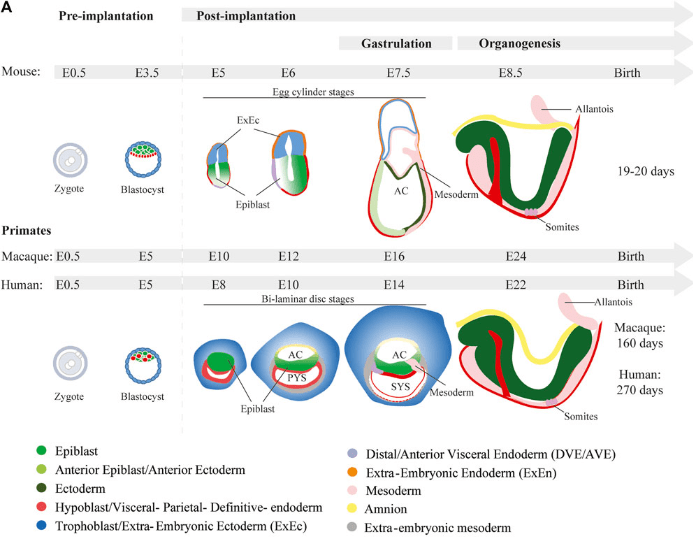 Pour le reste, le modèle souris a longtemps été la référence pour le développement des mammifères mais il existe de grandes différences entre le développement des rongeurs et des primates (dont le dernier ancêtre commun date d’environ 75 millions d’années), notamment la topologie générale de l’embryon au stade de la gastrulation.