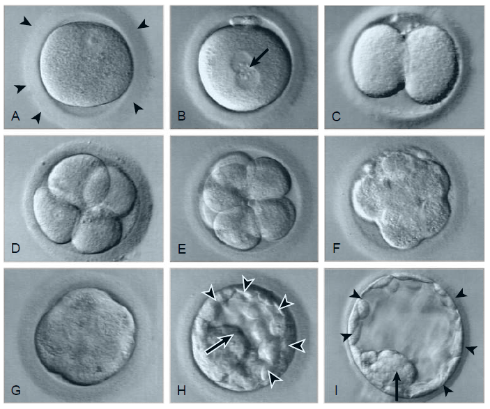 les pronoyaux mâle et femelle (flèches) se sont formés. C, Stade à deux cellules. D, Stade à quatre cellules. E, Stade à huit cellules. F, Morula initiant la compaction. G, Morula compactée. H, Blastocyste précoce,