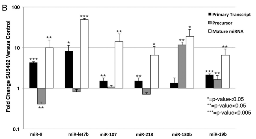 5.1 : L’ARN polymérase II. 5.2 : Les pré-miARN sont produits par le complexe Drosha dans le noyau et les miARN mature sont produits par Dicer puis RISC dans le cytoplasme. 5.3 : Pour les pri-miARN, il faut choisir au moins une des deux amorces de telle manière à ce qu’elle reconnaisse des séquences qui ne sont présentes que dans le pri-miARN et non pas dans les formes plus matures car elles auront été excisées. Pareil pour les amorces pour les pré-miARN. Pour le miARN, les séquences seront trouvées dans les précurseurs donc on ne peut pas trouver d’amorces spécifiques mais on peut soustraire le signal obtenu par les précurseurs du signal obtenu avec les amorces des miARN. 5.4 : Globalement l’inhibition de la signalisation FGF aboutit à une augmentation des miARN matures. Cela provient en partie d’une stimulation de la transcription des gènes codant ces miARN car on observe une augmentation de la quantité de pri-miARN. Dans certains cas, la baisse de la quantité de pré-miARN indique une stimulation de leur maturation en miARN matures (miR-9 et miR-218 et dans une moindre mesure miR-let7b). Pour d’autres cas, c’est l’étape de maturation des pri- en pré-miARN qui est stimulée (miR-130b). On en conclut que FGF inhibe la production et la maturation des précurseurs des miARN à différents niveaux.