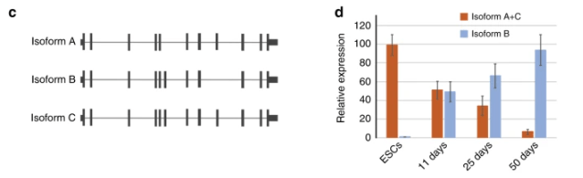 9.1 : On observe que certains exons sont présents dans des isoformes et pas dans d’autres (par exemple, le 6ème exon est présent dans les isoformes B et C mais pas dans l’isoforme A). On en déduit qu’il s’agit d’un épissage alternatif. 9.2 : Les isoformes A et C ont l’exon 9 en commun mais il n’est pas présent dans l’isoforme B. Il suffit donc de choisir des amorces pour la qPCR qui soient dans l’exon 9. Pour suivre l’expression de l’isoforme B qui n’a pas d’exon 9, on peut choisir des amorces dans les exons 8 et 10, la taille du fragment obtenu sera plus courte pour l’isoforme B que pour les isoformes A et C (où l’exon 9 rallonge la séquence entre les deux amorces). 9.3 : L’expression des isoformes A et C sont quasi-exclusives dans les cellules ES non différenciées mais elle diminue au cours de la différenciation neuronale. Dès le 11ème jour, l’épissage alternatif qui aboutit à l’expression de l’isoforme B est activé et représente la moitié des transcrits. La proportion de transcrits de l’isoforme B augmente ensuite jusqu’à atteindre plus de 90% en fin de protocole. On comprend que ZNF507 a des fonctions différentes dans les cellules souches et dans les cellules différenciées : ce n’est plus tout à fait la même protéine.