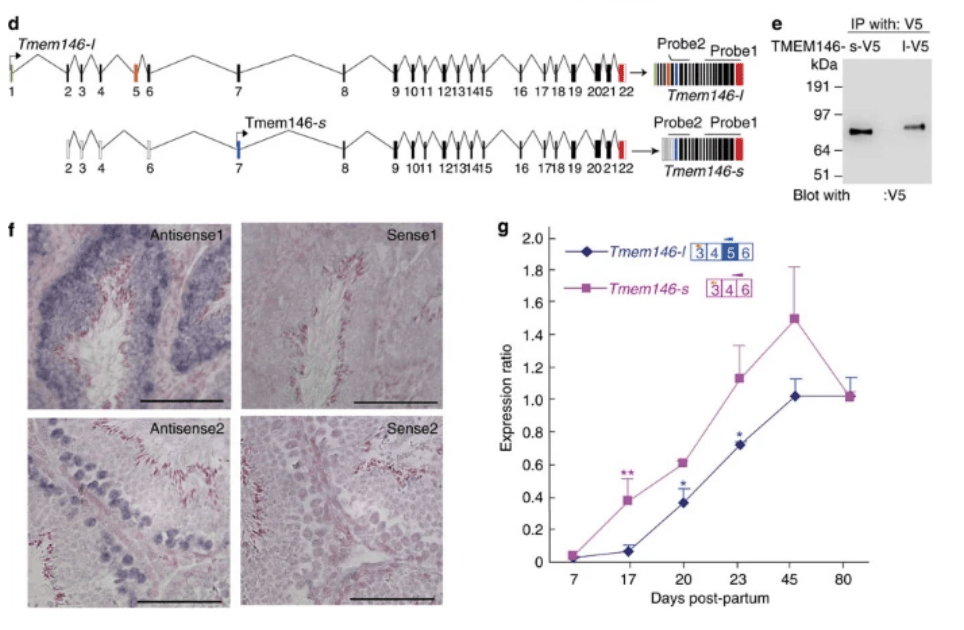 7.1 : On observe que les transcrits finaux n’ont pas la même composition en exons avec l’exon 1 et l’exon 5 manquant dans l’un des cas. Comme le montre le western-blot en e, cela donne des protéines de taille différente. On en déduit qu’il s’agit d’un cas d’épissage alternatif. 7.2 : Le site de démarrage de la traduction de la forme longue est dans l’exon 1. Or celui-ci est épissé dans l’ARNm de la forme courte et ce n’est que dans l’exon 7 que se trouve l’AUG de démarrage de la traduction. La protéine est donc plus courte car il lui manque les acides aminés codés par les exons 1 à 6. 7.3 : La partie N-terminale de la protéine est différente chez la forme longue et courte et donc il faut prendre un anticorps qui reconnait une partie commune entre les deux formes de la protéine et c’est le cas de la partie N-terminale. 7.4 : On doit choisir des séquences d’ARNm anti-sens qui s’hybrident avec des séquences spécifiques de la forme longue. La forme longue peut être reconnue par une sonde qui s’hybride avec les séquences correspondantes à l’exon 1 ou à l’exon 5. 7.5 : Les hybridations avec les sondes sens servent de témoin négatif : elles permettent d’estimer le marquage de bruit de fond lié à la procédure. 7.6 : Avec la sonde antisense 1, on voit que l’une ou l’autre des formes est exprimée dans toute la paroi des tubes séminifères alors que la sonde antisens 2 qui ne reconnait que la forme longue donne un signal que dans des cellules du côté basal des tubes séminifères dans la région où se trouvent les spermatogonies. On peut penser que la forme longue est d’abord exprimée dans les spermatogonies et qu’ensuite c’est uniquement la forme courte qui est exprimée dans des cellules germinales plus matures. Notez que la forme courte peut aussi être exprimée dans les spermatogonies (on n’a aucun moyen de le prouver ou de l’infirmer avec les données présentées). 7.7 : Le fragment à amplifier spécifique de la forme longue correspond à l’exon 5. Le fragment à amplifier pour la forme courte est à cheval entre l’exon 4 et l’exon 6. Les oligonucléotides utilisés pour amplifier ce deuxième fragment peuvent reconnaitre des séquences correspondantes aux formes longues mais le transcrit sera de taille plus importante dans ce cas, ce qui permettra de distinguer les transcrits. 7.8 : La forme courte est exprimée plus précocément que la forme longue et est exprimée plus fortement même lorsque la forme longue est également produite à partir des jours 17-20 après la naissance. A 80 jours après la naissance, les quantités relatives s’égalisent cependant par baisse de la quantité d’ARNm de la forme courte.